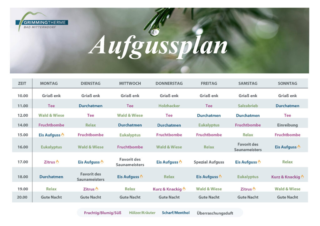 Täglich von 10 – 20 Uhr genießt du fruchtige, kräuterliche scharfe Aufgüsse. Lass dich von unseren Saunameistern verwöhnen und genieße die wohltuende Wärme und die harmonisierenden Düfte.
